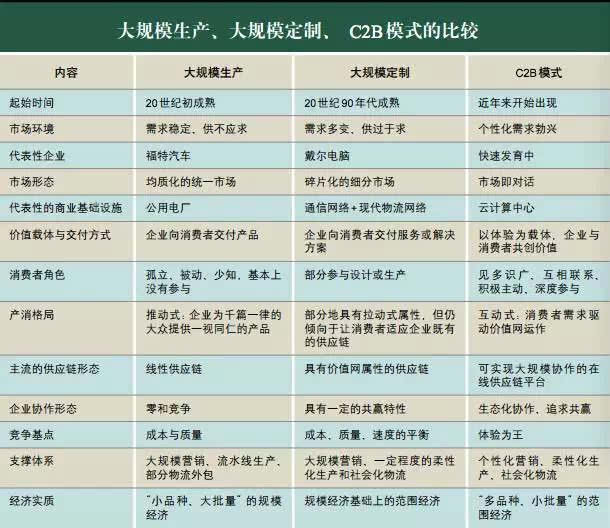 與工業(yè)時代“大生產(chǎn)+大零售+大品牌+大物流”的一整套體系相對應(yīng),基于個性化營銷、巨型網(wǎng)絡(luò)零售平臺、柔性化生產(chǎn)以及社會化供應(yīng)鏈的高速發(fā)展,C2B模式有了越來越堅實的支撐,其形貌、特征、機制也越來越成熟了。