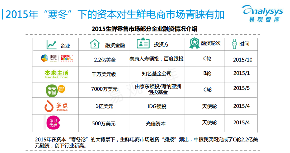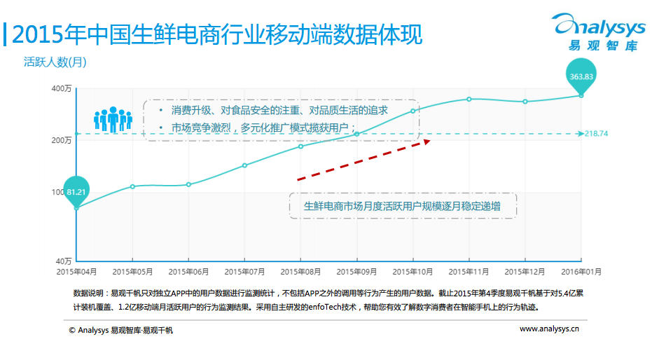 3月14日,易觀智庫發布了中國生鮮電商市場2016年度盤點報告。報告顯示,2015年生鮮電商市場交易規模達542億元,較去年增長87%。報告預測,2016年生鮮電商市場交易規模將超900億元。