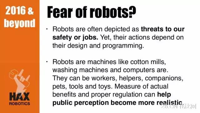 機器人就像紡織機、洗衣機和電腦一樣是機器。它們可以是工人、助手、伴侶、寵物、工具和玩具。有實際益處的措施和適當的監管可以讓公眾對機器人的認知更加現實。