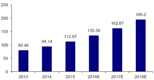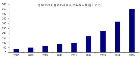 2007-2015年我國倉儲業(yè)自動化系統(tǒng)及設備投入規(guī)模(億元)