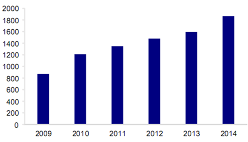 2009-2014年中國物流成本(單位:十億美元)