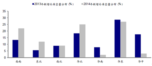 2013-2014年我國新增冷庫容量七大區(qū)域分布(%)