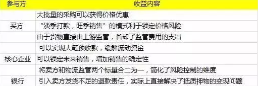 應收類產品幫助上游企業將應收賬款轉換成現金或應付票據;預付類產品則幫助下游企業擴大了單次采購額,提高了采購能力,將本應即期支出的現金資產轉換為短期借款或應付票據;現貨質押更為直接,以企業的存貨作為擔保方式,換取流動性更強的現金資產。雖然現貨融資通常沒有核心企業參與,但因該業務涉及對貨權的控制和物流監管企業的管理,從管理上與供應鏈金融流行的預付款渠道融資相近。