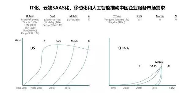 美國走過了3次浪潮(IT化、云端SaaS化、移動化),目前正在走第四次浪潮(AI),而中國市場很明顯的合并了IT、SaaS和Mobile的階段,尤其是企業服務市場,AI如何來臨還不明確。