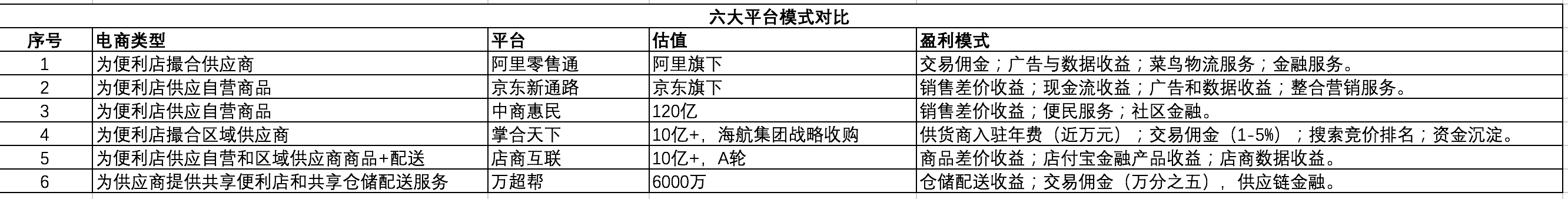 但在具體做法上快消品B2B平臺(tái)卻又有著巨大的不同。從以下表格里您會(huì)發(fā)現(xiàn)六個(gè)快消B2B平臺(tái) - 阿里零售通、京東新路通、中商惠民、掌合天下、店商互聯(lián)和萬超幫的巨大不同。