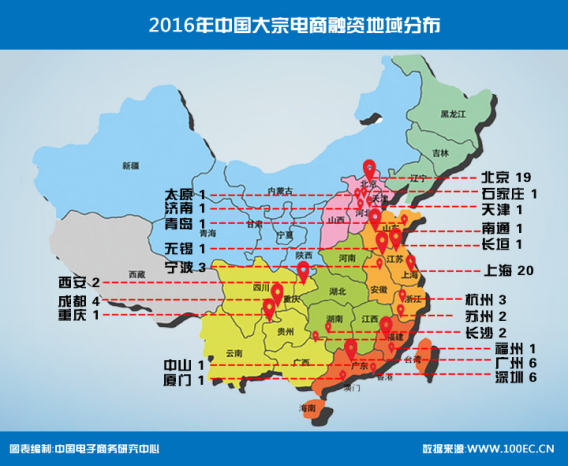 2016年大宗電商融資地域分布上,排在第一梯隊的是上海、北京、廣州、深圳、成都;排在第二梯隊的是寧波、杭州、長沙、蘇州、西安;排在第三梯隊的是重慶、福州、濟南、天津、石家莊、青島、廈門、無錫、太原等13個城市。