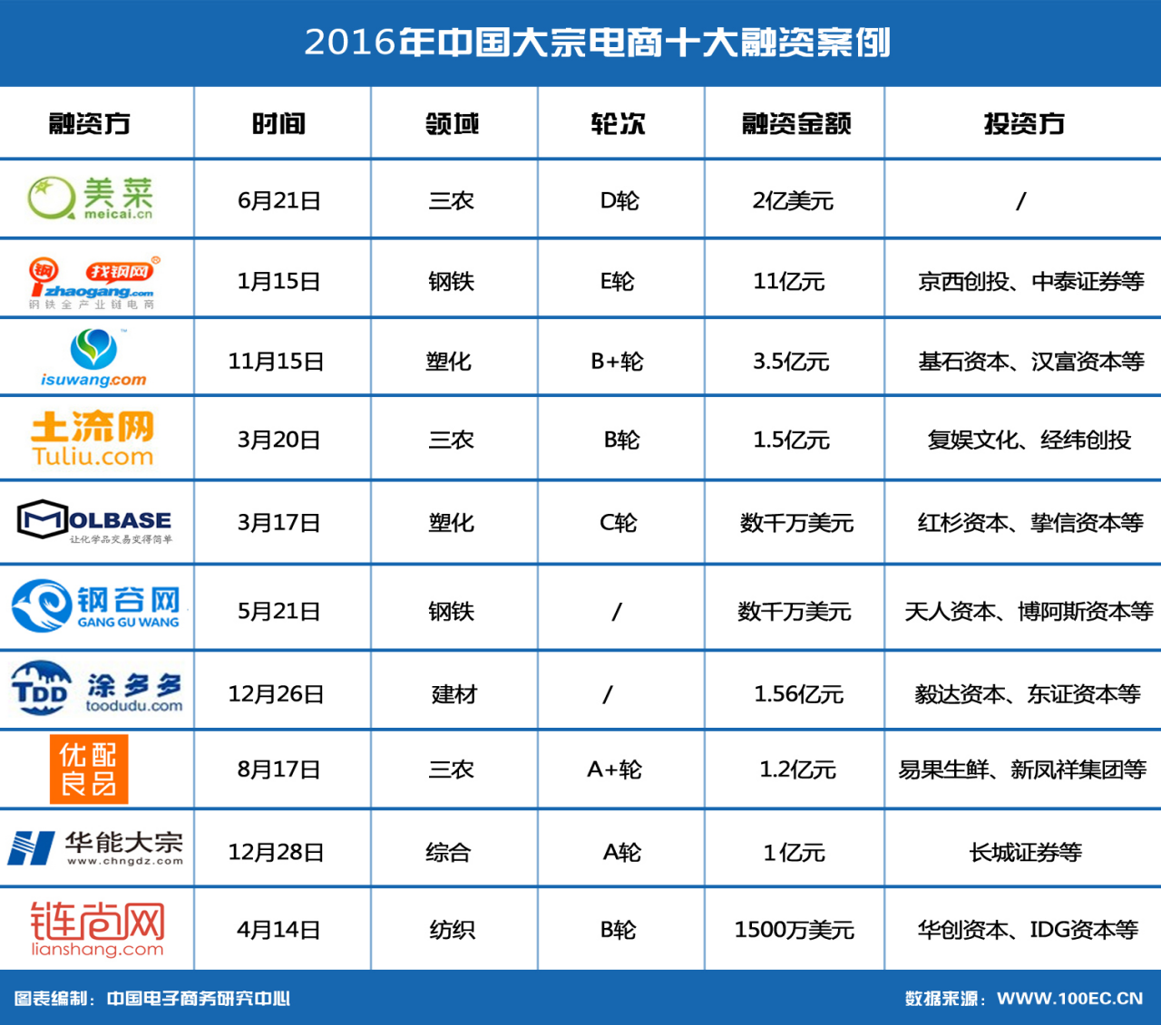 1)2016年在風投資金和產業資本的助力下,鋼鐵、煤炭、石油等大宗商品領域崛起一批實力強勁的電商公司,并出現了像找鋼網估值超過10億美金的獨角獸公司,融資過億的大宗商品電商企業達十數家之多。