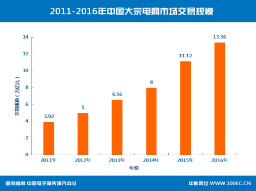 據中國電子商務研究中心(100EC.CN)監測數據顯示,2016年中國大宗電商市場交易規模達13.36萬億元,同比增長20.14%。