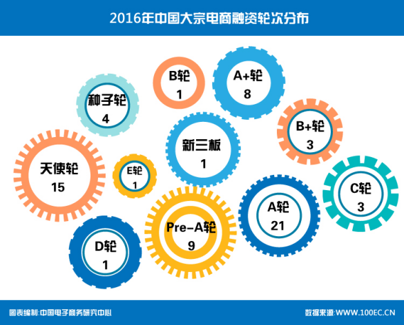 2016年在中國大宗電商融資輪次上,排名前三的分別是:發生A輪融資事件有21起、天使輪融資事件15起、Pre-A輪融資事件9起。