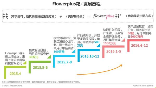 Flowerplus花+于2015年4月在上海成立,專注日常鮮花訂閱服務(wù),以傳遞美好的生活方式為品牌核心定位。成立一年內(nèi),先后獲得3輪融資,城市覆蓋、單月訂單額等運營數(shù)據(jù)增長迅速。2016年Flowerplus花+總覆蓋城市50座,月訂單額超過6000萬元。