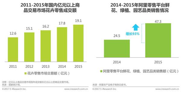2014-2015年阿里零售平臺上的鮮花、綠植、園藝品類的銷售額增長超過93%。鮮花產(chǎn)業(yè)的線上滲透率將逐步提高,催生鮮花消費的新市場。