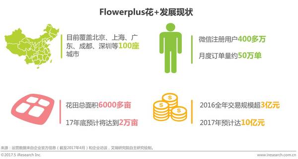 目前Flowerplus花+城市覆蓋范圍由2016年底的50座擴展到100座城市。目前覆蓋北京、上海、廣東、成都、深圳等一二線熱門城市,同時以此為中心,向周邊城市輻射。花田面積方面, Flowerplus花+在云南擁有6000多畝花田和專業(yè)基地,17年底預(yù)計將增長至2萬畝。優(yōu)質(zhì)的花源供給成為吸引消費者的關(guān)鍵, Flowerplus花+微信注冊用戶超過400萬,2016年全年交易額超過3億元,預(yù)計17年將達到10億元。