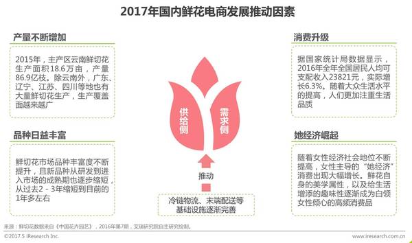 供需市場和基礎(chǔ)設(shè)施共同推動了鮮花電商的發(fā)展。從供給側(cè)來看,生產(chǎn)數(shù)量和生產(chǎn)地面積逐步提升,鮮花品種也日益豐富,市場投放加快。需求側(cè)來看,主要是消費升級以及“她經(jīng)濟”崛起,給鮮花電商市場帶來的新機會。除此之外,物流方面的進步,特別是冷鏈物流的發(fā)展和日益完善,都推動了鮮花電商的發(fā)展。