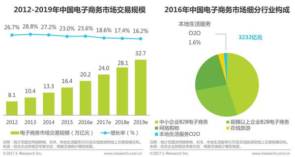 2016年中國電商市場交易規(guī)模超20萬億,增速基本持平
