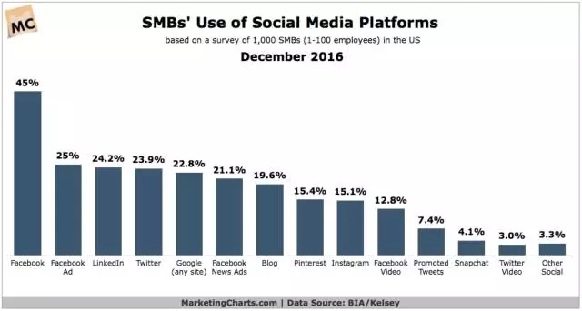 上述的企業(yè)是各自領(lǐng)域的領(lǐng)先者,有著強(qiáng)大的資源優(yōu)勢(shì),通過與社交網(wǎng)絡(luò)的化學(xué)作用,希冀打通CPC2的通路。基于上述討論邏輯,Twitter仍然具有上述價(jià)值。而同樣具有合作價(jià)值的社交媒體則甚至可能包括Pinterest、Instagram這樣的廠商。通過下圖,我們可以看到中小企業(yè)對(duì)這些平臺(tái)的重視程度。