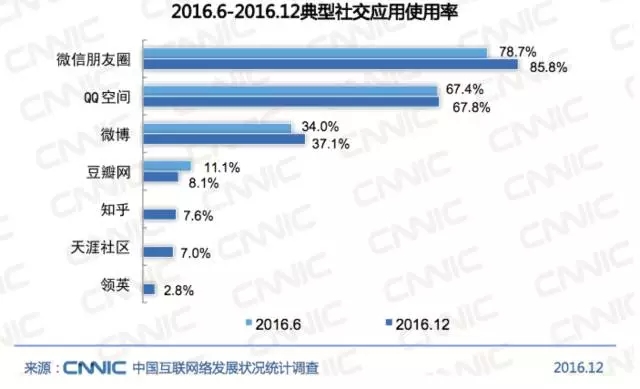 視線回到國(guó)內(nèi)。上面說國(guó)內(nèi)的報(bào)道并未把上述新聞串聯(lián)起來,如果要找罪魁禍?zhǔn)祝斜染W(wǎng)的答案是缺乏對(duì)標(biāo)。在美國(guó),我們看到了Facebook,Twitter等社交媒體成為了主流互聯(lián)網(wǎng)的重要組成部分;在國(guó)內(nèi),社交媒體有一個(gè)重要的定語,依附于即時(shí)通訊的社交媒體??碈NNIC第 39 次中國(guó)互聯(lián)網(wǎng)絡(luò)發(fā)展?fàn)顩r統(tǒng)計(jì)報(bào)告中的兩組統(tǒng)計(jì)。