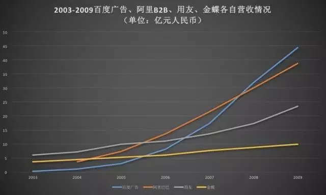 所以我們說國(guó)內(nèi)不存在標(biāo)準(zhǔn)的CPC2標(biāo)的。但是在中國(guó)CPC2一定有更廣闊的前景。中國(guó)目前的企業(yè)信息化仍然落后,企業(yè)特別是中小企業(yè)使用互聯(lián)網(wǎng)的意識(shí)正在增強(qiáng),而其中對(duì)于開源(擴(kuò)大營(yíng)收)的需求毫無疑問遠(yuǎn)勝于節(jié)流(流程化帶來的成本節(jié)約)。下圖反映了百度、阿里、金蝶、用友四家廠商在中國(guó)互聯(lián)網(wǎng)發(fā)展早期的營(yíng)收情況。作為開源代表的百度、阿里巴巴,無論在中國(guó)互聯(lián)網(wǎng)的早期還是目前階段均穩(wěn)壓節(jié)流代表的廠商一頭。