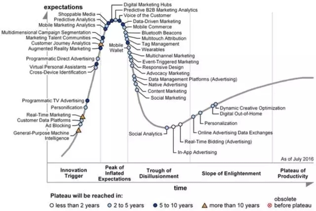 在托比網(wǎng)看來,CPC2將擁有廣闊的未來。而近期Gartner的一份研究報(bào)告旁證了這一趨勢(shì)。近期Gartner公司披露的Hype Cycle for Digital Marketing and Advertising( 2016)給了我們啟示——營(yíng)銷技術(shù)(Martech)和廣告技術(shù)(Adtech)的融合、事件驅(qū)動(dòng)和即時(shí)營(yíng)銷、用戶畫像的個(gè)性化,以及溝通線索的使用是營(yíng)銷的四大關(guān)鍵因素,他們將把營(yíng)銷引導(dǎo)進(jìn)入數(shù)據(jù)時(shí)代。