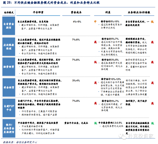 我們認(rèn)為,金融服務(wù)的盈利模式主要來自息差收入,其競爭力強(qiáng)弱取決于資金來源的成本和融資服務(wù)的風(fēng)險(xiǎn)控制。從資金來源劃分,可分為自有資金、銀行資金和自建互聯(lián)網(wǎng)融資平臺(tái)獲取資金。從融資服務(wù)方式劃分,可分為實(shí)物質(zhì)押、訂單融資、貿(mào)易融資、應(yīng)收賬款保理和融資租賃等。