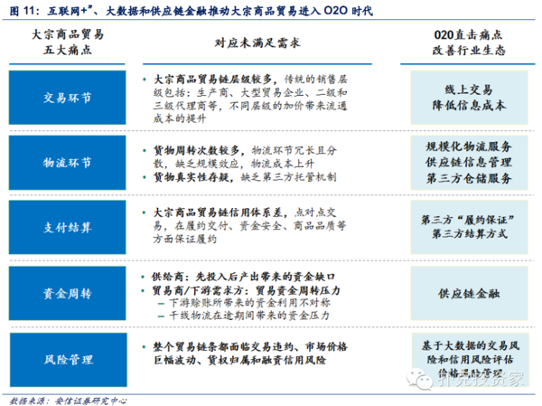 繼供應(yīng)鏈金融之后,"互聯(lián)網(wǎng)+"直擊痛點(diǎn),推動(dòng)大宗商品貿(mào)易進(jìn)入了O2O時(shí)代。一是交易環(huán)節(jié)通過線上交易,降低信息成本,打破冗長貿(mào)易鏈條;二是物流環(huán)節(jié)輸出規(guī)模化物流、倉儲(chǔ)和供應(yīng)鏈信息管理服務(wù),降低物流成本,保障物權(quán)安全;三是支付結(jié)算環(huán)節(jié)通過第三方履約保障和結(jié)算,化解履約風(fēng)險(xiǎn);四是資金周轉(zhuǎn)環(huán)節(jié)全程提供供應(yīng)鏈金融服務(wù),從上游礦山到下游消費(fèi)企業(yè)全面化解融資難題;五是輸出專業(yè)的風(fēng)險(xiǎn)管理服務(wù),基于企業(yè)信息和交易記錄大數(shù)據(jù),有效管理交易風(fēng)險(xiǎn)和信用風(fēng)險(xiǎn),基于專業(yè)的動(dòng)態(tài)庫存風(fēng)險(xiǎn)管理能力,協(xié)助客戶化解價(jià)格風(fēng)險(xiǎn)。