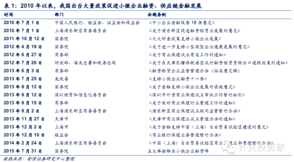 二是監(jiān)管環(huán)境支持。自2010年以來,以國務(wù)院、發(fā)改委和一行三會(huì)為代表的監(jiān)管機(jī)構(gòu)也出臺(tái)了大量政策,鼓勵(lì)和支持小微企業(yè)融資,促進(jìn)商業(yè)保理、融資租賃等供應(yīng)鏈金融業(yè)態(tài)發(fā)展,創(chuàng)造了良好的政策環(huán)境。