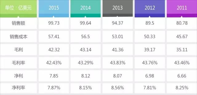從固安捷近五年的營收情況上看,呈上升趨勢,2015年銷售額已經接近100億美金,毛利率基本維持在42%-43%之間,凈利潤率在7.8%-8.5%之間。