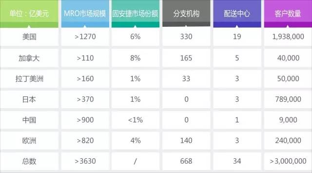 時至今日,固安捷業務已覆蓋全球。其中,美國和加拿大是其最大市場,市場份額分別為6%,8%。同時,拉丁美洲、亞洲、歐洲也成為其新的市場目標。