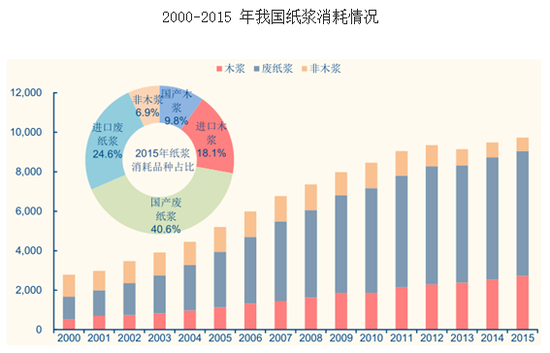 我國是全球紙漿量消耗最高的國家,在我國紙和紙板的生產消費仍在穩定增長的情況下,主要造紙原材料之一的——紙漿,需求十分旺盛。而由于我國造紙原料結構長期以非木材纖維為主,木漿及高檔紙漿嚴重短缺,因此進口依賴度較高。從上游消耗紙漿比例來看,目前我國是以廢紙漿作為主要造紙原材料,2015年廢紙漿占比約65%左右,自2000年起廢紙漿已替代非木漿成為行業主要原料來源。