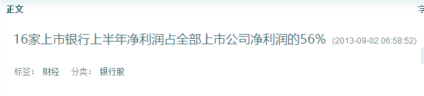 在中國2013年的時候統計,16家上市銀行上半年的凈利潤占全部上市公司利潤的56%,因為企業都在用銀行的錢,而且銀行的利潤算是便宜的,平均年息在10%以內。