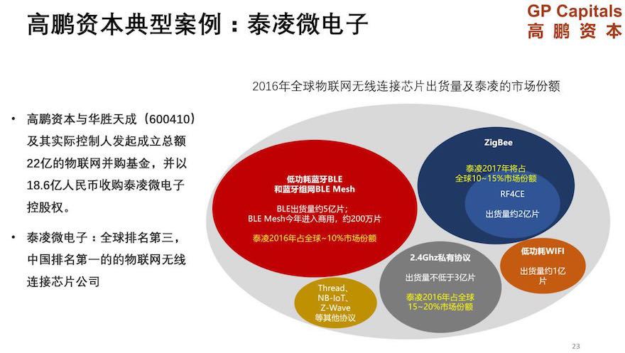 高鵬資本與華勝天成(600410)及其實際控制人發起成立總額22億的物聯網并購基金,并以18.6億元人民幣收購泰凌微電子控股權。泰凌微電子是全球排名第三、中國排名第一的物聯網無線連接芯片公司。每一件通過無線通信技術接入的物體都需要一個無線連接芯片,在工業物聯網的整個產業鏈中,高鵬資本已經在最基礎、最核心的芯片部分提前布局,并以此作為切入點,橫向和縱向深挖產業鏈,繼續在智能傳感器、MCU、云端智能、智能終端和深度行業應用上投資。