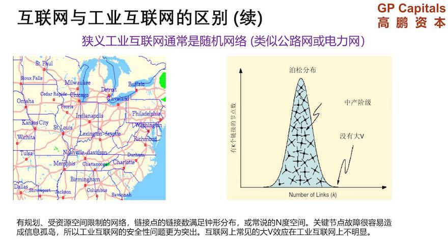 而工業互聯網在設備側更像是隨機網絡。隨機網絡可以用高速公路系統為代表,其中包含一些節點和隨機布置的連接,在這種類型的網絡中,節點連接的分布將遵循鐘形曲線分布,按照這種分布,大部分節點擁有的連接數目差不多。工業互聯網的隨機網絡特性使得設備側的網絡難以具備價值指數級增長的網絡效應。