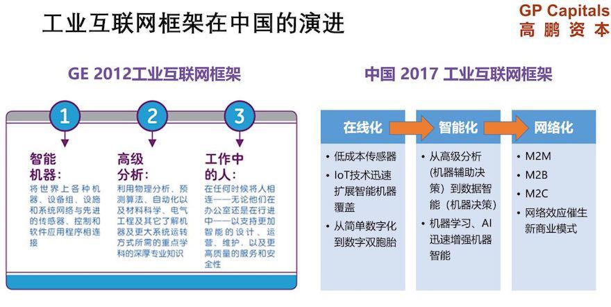 工業互聯網在中國將會按在線化、智能化和網絡化的三步演進。首先是低成本傳感器的大量普及,實現工業機器設備和物品的在線化,獲得終端數據;接下來,通過高級分析、機器學習等智能化技術分析數據并反饋到設備和運營,提高整體運營效率;最終形成廣泛連接的工業互聯網,產業網絡效應,將會迸發新的商業模式。這與GE2012年提出的工業互聯網框架已經有了較大的區別。
