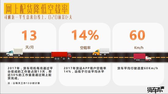 在使用貨運(yùn)APP的司機(jī)中,近一半生意來自線上。2017年,使用貨運(yùn)APP的貨車空載率為14%,遠(yuǎn)低于行業(yè)平均水平,平均行駛速度為60公里/小時(shí)。互聯(lián)網(wǎng)帶來的效率提升作用明顯。