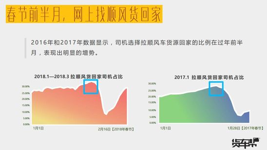 而春節(jié)前夕,也迎來春運(yùn)高峰期。司機(jī)們?cè)诜掂l(xiāng)的同時(shí)也不忘賺錢。春節(jié)前半月,司機(jī)選擇拉順分車貨源回家的比例呈明顯增長趨勢(shì)。