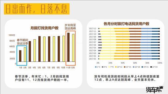 數(shù)據(jù)顯示,貨車司機(jī)基本全天無休,凌晨4點(diǎn)開始找貨,9點(diǎn)達(dá)到高峰,找貨一直持續(xù)到深夜12點(diǎn)。此外,年底迎來貨運(yùn)高峰期,而1、2月的著火用戶僅占11、12月用戶的一半。