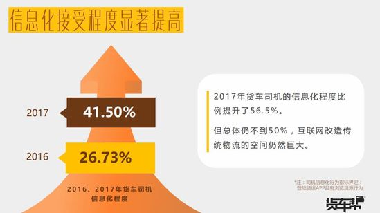 2017年,司機(jī)信息化接受比例提升了56.5%,但總體信息化比例仍只有41.5%,可見互聯(lián)網(wǎng)改造傳統(tǒng)物流的空間仍然巨大。