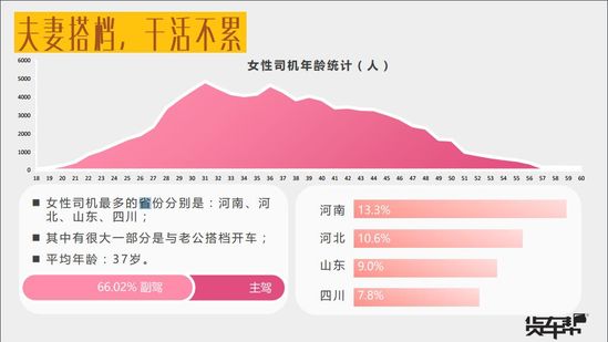 女司機(jī)主要來自河南、河北、山東、四川等運(yùn)力大省,平均年齡37歲,其中,66%的女性為副駕,大部分是為了節(jié)省支出,與老公搭檔開車。