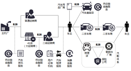 汽車交易B2B電商完成主機廠與經銷商的直接對接,快速將渠道下沉至三四線城市,解決了這些地區經銷商拿貨難的痛點。汽車交易B2B提供以交易為核心的增值服務,如金融、物流、倉儲、資金擔保等。二手車B2B平臺提供檢測和在線拍賣服務,解決二手車交易中的產品標準化和價格問題。
