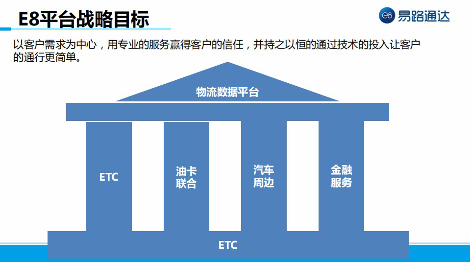 易路通達以客戶需求為中心,以ETC卡為核心基礎,運用大數據、區塊鏈及人工智能等前沿技術,向油卡聯合、汽車周邊、金融服務三個方向發力,制定E8平臺戰略目標,構建物流數據平臺。張建強表示,E8 平臺戰略目標,可嫁接各種各樣的服務。易路通達會鋪設好所有的基礎架構,在平臺上接入各種各樣的大數據的應用,形成一個生態平臺,后續還會通過不斷的技術投入,更好的去服務客戶,去解決通行的痛點。