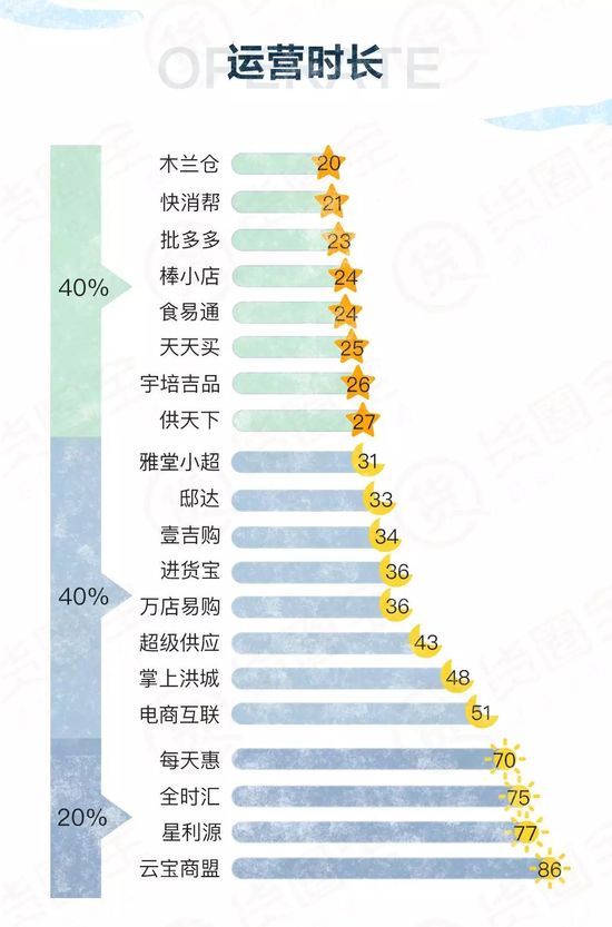 在上圖停運電商運營時長的表單中,木蘭倉運營時長最短,只運營1年零8個月。云寶商盟運營時間最長,運營7年零2個月。