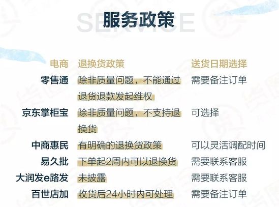 從用戶體驗來講,各大電商送貨日期均可自主選擇。但在退換貨政策方面相差較大,零售通和掌柜寶除質量問題,不可退換貨。但中商惠民、易久批和百世店加有明確的退換貨政策,和線下批發商相似。符合雜貨鋪的日常習慣。