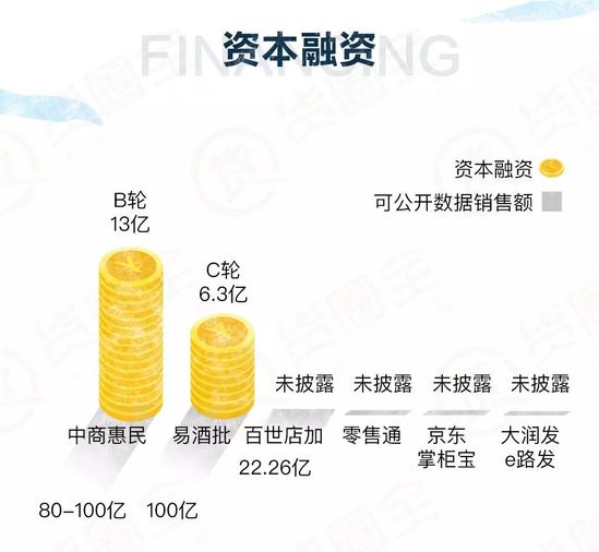 中商惠民和易久批分別融資13億和6.3億。從生態狀況可推測零售通掌柜寶絕不低于二者,大潤發和百世店加投入則相對較少。