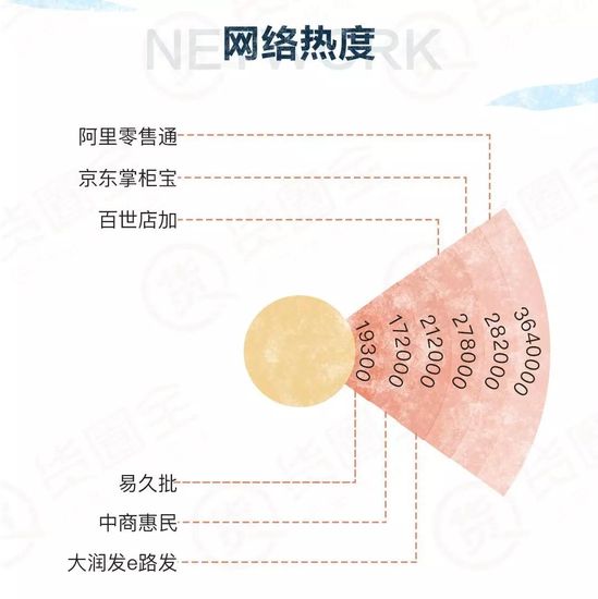 從百度搜索量來看,總體可分為4個梯隊:第一梯隊阿里零售通,第二梯隊京東掌柜寶和中商惠民,第三梯隊為大潤發e路發和百世店加,第四梯隊為易久批。其中零售通遙遙領先。