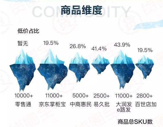 得出結論,京東掌柜寶與百世店加價格偏高,易久批與百世店加商品展示SKU較少且易久批以酒類SKU為主。京東掌柜寶、大潤發和零售通的商品SKU數量最多,在其中大潤發e路發的價格優勢很大。總體來說大潤發e路發在商品維度上領先。