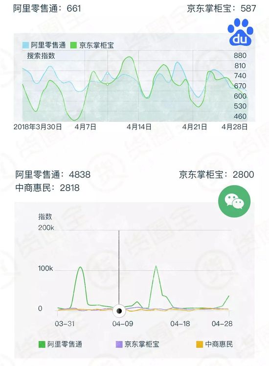百度指數只收錄了阿里零售通和京東掌柜寶二者,微信指數則收錄中商惠民。無疑阿里零售通和京東掌柜寶的影響力巨大,但中商惠民的關注度也在上升,微信指數與京東掌柜寶相差不大。