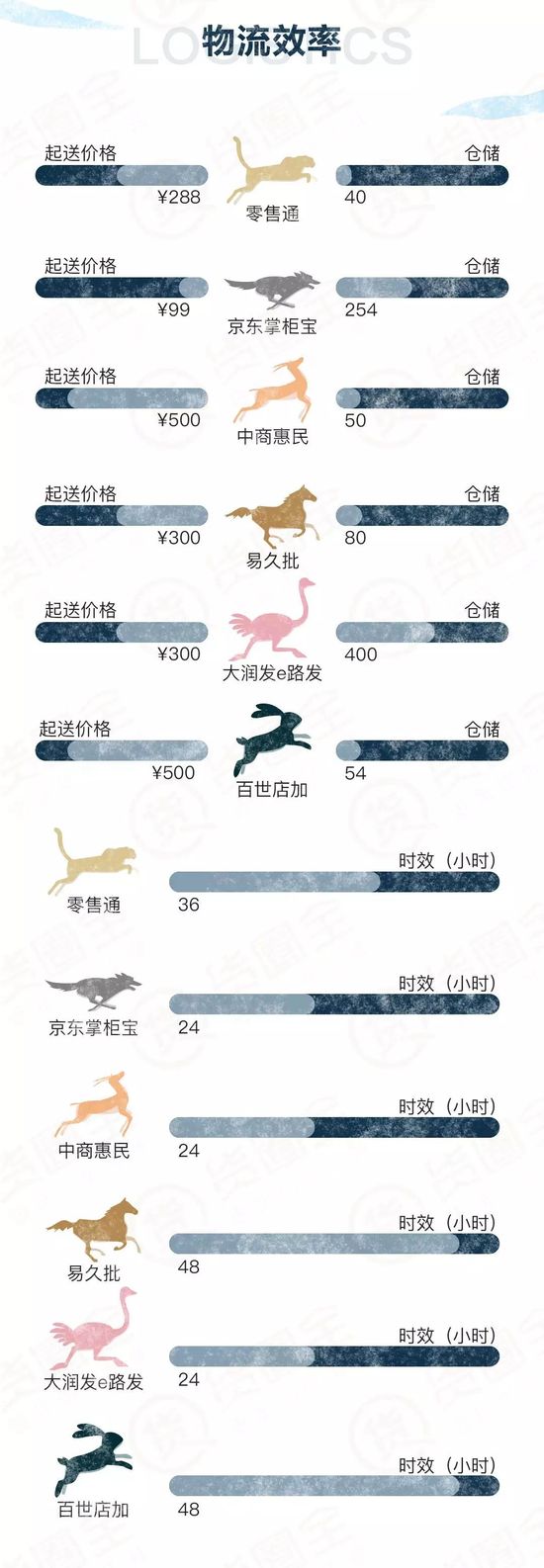 在物流系統中京東掌柜寶和大潤發e路發有較大的優勢,其自有倉庫數量優于其他電商且可24小時送達。6家起送價格均在雜貨鋪可接受范圍,但京東掌柜寶以99元的起送價領先其他所有電商。