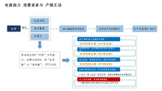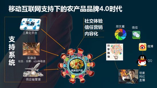 農(nóng)產(chǎn)品品牌電商4.0時代;就是體驗感增加、接觸感增加,我們的農(nóng)產(chǎn)品品質(zhì)的透明化增長,概而言之就是“電商助力消費者參與產(chǎn)銷互動”。這個時代,我們會有更多的移動、即時、物聯(lián)網(wǎng)手段去介入到前端的生產(chǎn),拉近消費者與生產(chǎn)者之間的關(guān)系,消費者可以成為生產(chǎn)者,而生產(chǎn)者也可以更多的接觸到消費者的體驗和感受,這個應(yīng)該是未來。