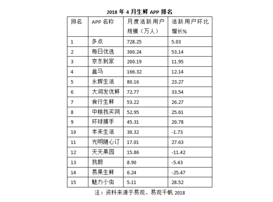 根據(jù)易觀披露的2018年最新生鮮電商APPTOP15榜單,生鮮電商領域已有多個領先者為綜合電商,或擁有綜合類電商、互聯(lián)網(wǎng)巨頭背景。該榜單顯示,多點以728.25萬活躍用戶規(guī)模依舊占據(jù)榜首,每日優(yōu)鮮以300.24萬活躍用戶規(guī)模位居第二,京東到家以200.19萬活躍用戶位居第三。