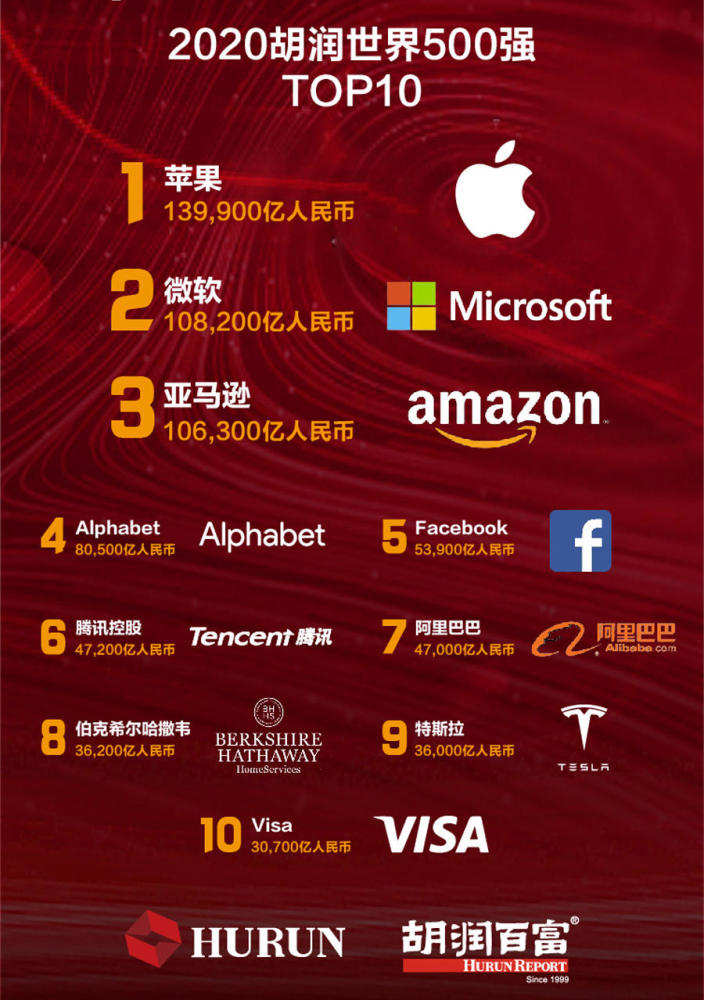 2020胡潤世界500強榜發(fā)布:蘋果、微軟、亞馬