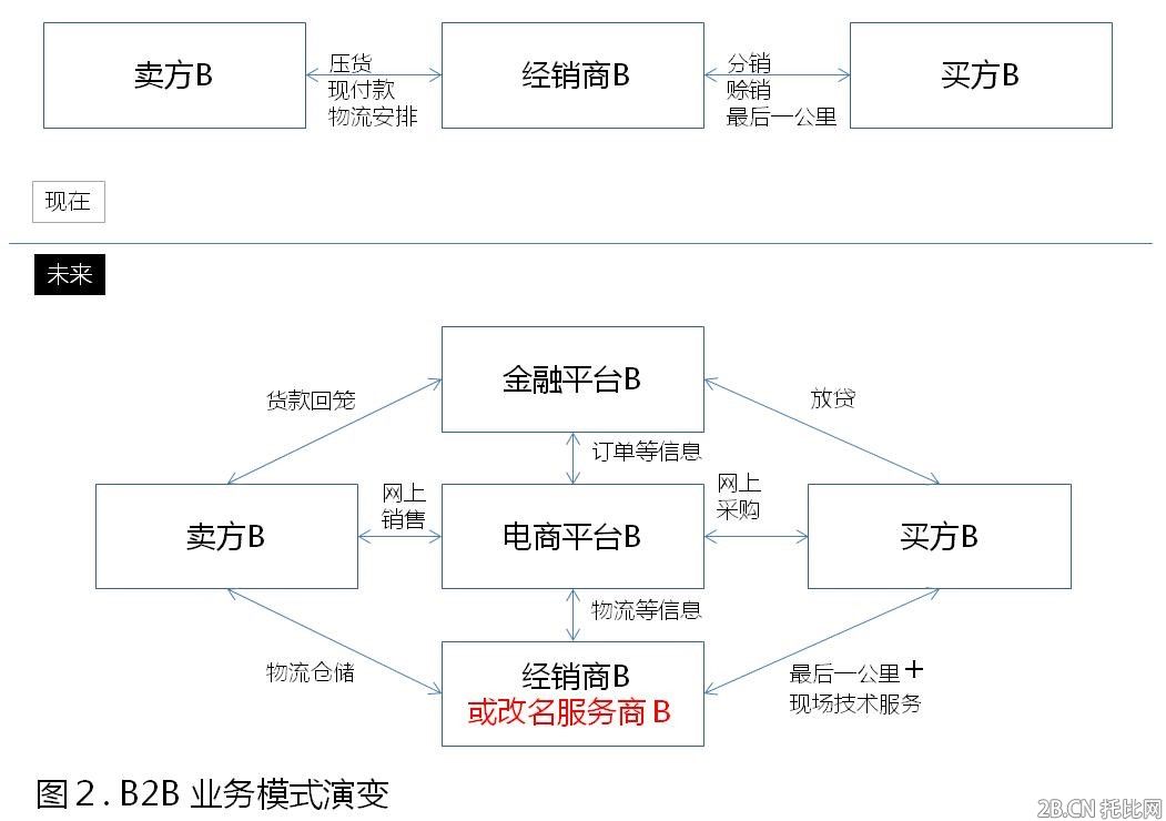 3、筆者預測,一個大而全、通吃天下的電商平臺可能不會再出現。傳統B2B世界就是一個精英們互相合作的世界,各行有各業的專長,需配合完成一個完整的交易鏈條,好比打麻將如果三缺一是沒法打牌的。這些鏈條上不同專長的精英將不得不重新審視自身的優勢,剝離掉互聯網技術可以取代的業務,繼續發揮他們的核心價值。對于賣方企業總是希望加大直銷,以前靠經銷商,通過電商就可能打破這個傳統模式,買方企業直接賣給了下家,那么傳統經銷商干什么呢?經銷商的存在通常有兩個作用:一是他們有分銷網絡和倉儲等資源,甚至包括一些當地的經營許可,這部分功能他們可以繼續,但主要就是幫賣家企業到達最終買家的倉儲物流服務;其次,賣家常離不開經銷商的方面比如有:經銷商可以賒銷,賣家可以及時回籠貨款,這部分可能在互聯網時代被線上金融企業取代,比如說螞蟻金服,在未來基于交易的銀行信貸產品在規模上可能更有競爭性,會替代經銷商的賒銷功能,經銷商可能不得不退出這部分舞臺。傳統的B2B直線式模式會演如下圖。